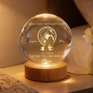 Celebrate a magical milestone with a personalized keepsake designed to honor her very first Mother’s Day. This stunning crystal ball LED night light features a custom moon phase representing the exact night she became a mom, paired with a heartfelt message, names, and a meaningful date. The glowing crystal sphere beautifully captures the tender moment between mother and child, creating a warm and sentimental display she’ll cherish for years to come.