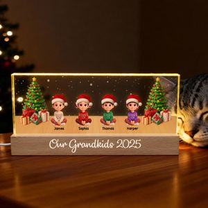 Bring the magic of the holidays into any home with this beautifully illuminated acrylic night light, designed to celebrate the joy your grandkids bring all year long. This festive display instantly captures attention with its warm LED glow, charming holiday characters, and customizable names—creating a heartfelt keepsake that feels personal and unforgettable. Printed with vibrant detail (never engraved), it becomes a cherished décor piece that adds warmth, nostalgia, and a touch of holiday wonder wherever it’s displayed. A truly thoughtful gift that grandparents will treasure each season.